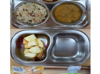 오전간식 사과 점심 소고기볶음밥 된장국 돈까스 오이피클 유기농식혜 오후간식 우리밀바나나빵 파인한자..