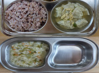 오전간식 얼갈이배추된장죽 점심 잡곡밥 물만두계란국 돈육양송이버섯볶음 과일야채샐러드 김치 오후간식 삶..