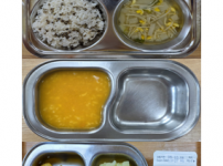 오전간식 계란연근죽 점심 검정보리쌀밥 감자애호박된장국 순살코다리조림 모둠과일야채샐러드 김치 오후간식 ..