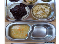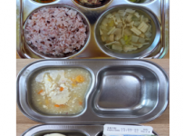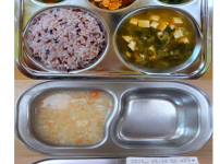 오전간식 새송이버섯죽 점심 찰흑미밥 얼갈이두부된장국 닭다리살토마토소스볶음 미역줄기볶음 김치 오후간식 ..