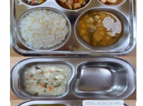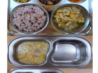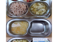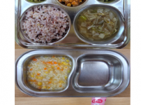 오전간식 두부미나리죽 점심 찰현미밥 감자양파된장국 닭다리살납작당면볶음 오이크래미무침 김치 오후간식 ..