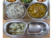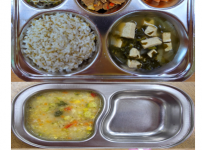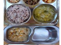오전간식 미역쌀죽 점심 검정보리쌀밥 애호박감자된장국 닭가슴살당면볶음 얼갈이된장무침 김치 오후간식 유..