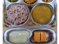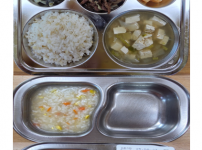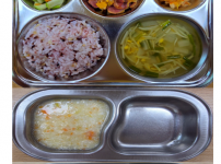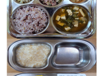 오전간식 두부가지죽 점심 찰흑미밥 맑은콩나물무국 소고기양송이볶음 크래미양배추샐러드 김치 오후간식 삶..