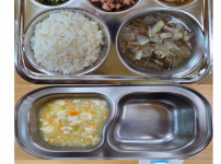 오전간식 잔멸치죽 점심 돈육잡채덮밥 근대두부국 비엔나어묵볶음 김치 오후간식 삶은계란 토마토 요구르..