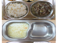 오전간식 소고기죽 점심 잡곡밥 순두부계란국 훈제오리파프리카볶음 감자채베이컨볶음 김치 오후간식 볶음김..
