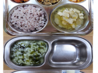 오전간식 근대된장죽 점심 잡곡밥 맑은콩나물무채국 떡산적구이 과일야채샐러드 김치 오후간식 삶은계란 ..