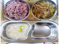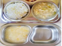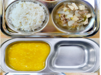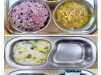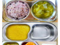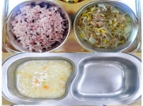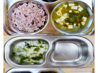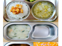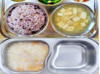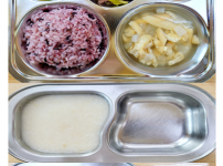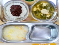 오전간식 영양누룽지죽 점심 찰흑미밥 유부무채국 소고기연근조림 콩나물미나리무침 김치 오후간식 삶..