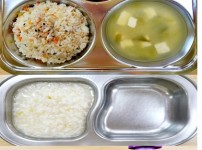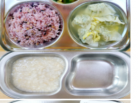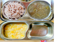 오전간식 콩나물죽 점심 찰흑미밥 얼갈이두부된장국 등심돈가스/소스 모둠야채과일샐러드 김치 오후간식 햄..