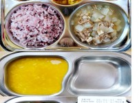 오전간식 영양단호박죽 점심 찰흑미밥 소고기버섯무국 돈육짜장볶음 모둠야채계란말이 김치 오후간식 콩나물..