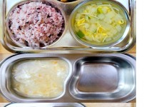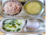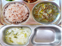 오전간식 : 얼갈이된장죽 점심 : 차수수밥 순한육개장 돈육짜장야채볶음 오이파인애플무침 김치 오후간..