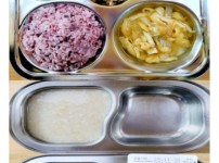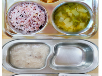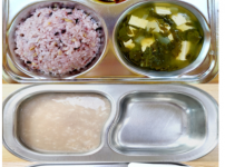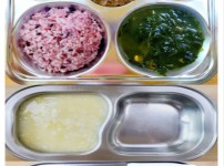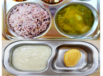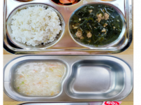 오전간식 : 옥수수죽 점심 : 찰흑미밥 홍합살미역국 소고기연근조림 아삭오이사과무침 김치 ..