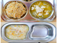 오전간식 : 참치야채죽 점심 : 닭가슴살데리야끼볶음밥 김치순두부찌개 가지굴소스볶음 사과 김치 오후간식..
