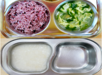 오전간식 :순두부야채죽 점심 :찰흑미밥 두부애호박된장국 모둠해물야채조림 미역줄기볶음 김치 오후간식 ..