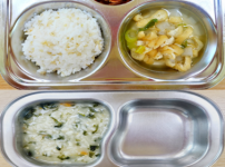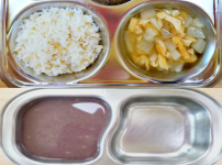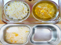 오전간식 :미역쌀죽 점심 :베이컨카레라이스 청경채두부국 오이청포묵무침 김치 오후간식 : 계란 ..
