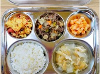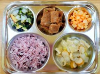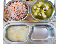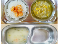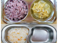 4월 3일 수요일 소고기죽 잡곡밥 근대두부된장국 돈육짜장볶음 크래미애호박볶음 김치 물만두..