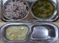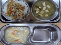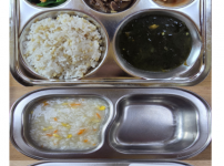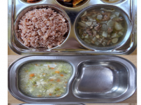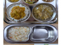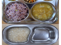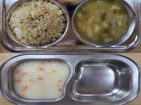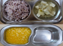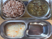 오전간식 영양누룽지 점심 잡곡밥 감자양파된장국 돈육가지볶음 콩나물미나리무침 김치 오후간식 삶은고구마..