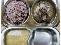 2023년 11월 27일 월요일 오전간식 : 참치야채죽 점심 : 잡곡밥 소고기무채국 메추리알케찹조림 오이..