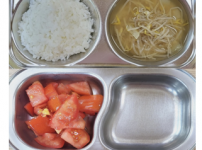 2023년 6월 9일 금요일 오전간식 : 방울토마토 점심 : 돈육김치볶음밥 아욱무국 도토리묵상추무침 김치..
