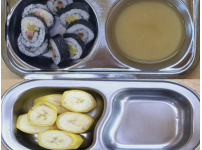 2023년 4월 27일 목요일 오전간식 : 바나나 점심 : 참치김밥 미소국 비엔나케찹야채볶음 망고푸딩 ..