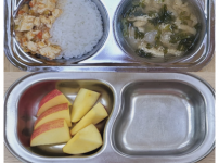 2023년 4월 28일 금요일 오전간식 : 사과 점심 : 마파두부덮밥 쑥갓유부된장국 애호박감자채볶음 김..