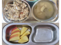 2023년 5월 4일 목요일 오전간식 : 아욱된장죽 점심 : 귀리밥 모듬어묵국 떡갈비구이 파프리카사과무침..