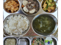 2023년 3월 7일 화요일 오전간식 : 영양녹두죽 점심 : 현미밥 아욱된장국 소고기메추리알조림 오이사과..