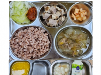 2022년 11월 14일 월요일 오전간식 : 잔멸치죽 점심 : 찰흑미밥 청경채두부국 닭가슴살당면볶음 모..