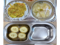 오전간식 바나나 점심 카레라이스 애호박두부된장국 도토리묵사과무침 김치 오후간식 찐빵 우유..